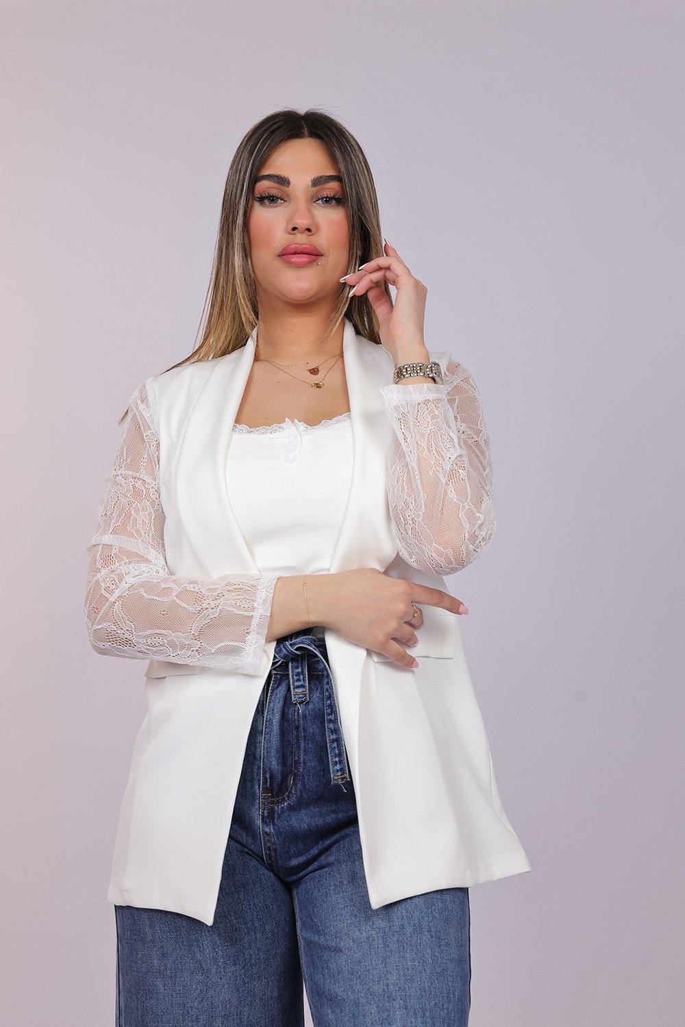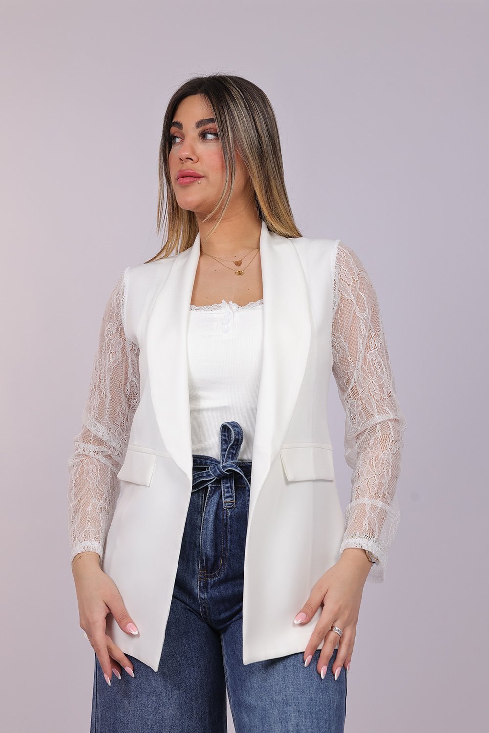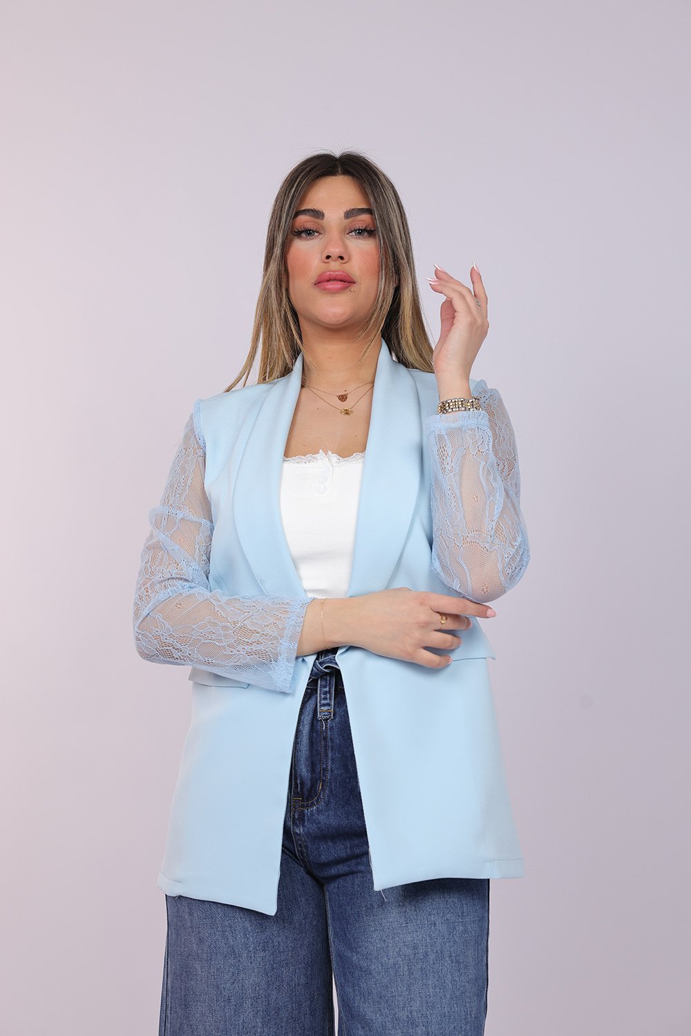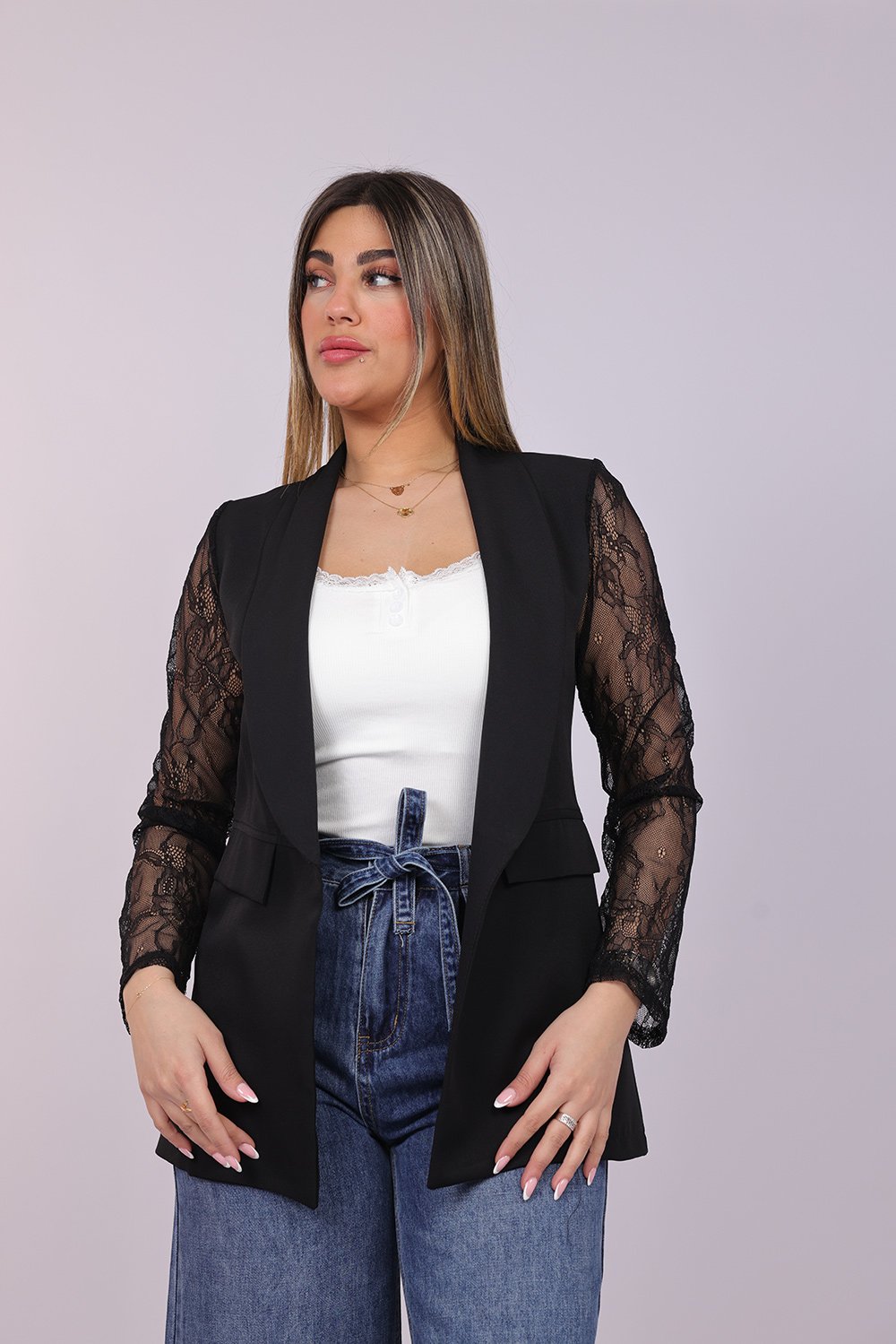 Blazer ouvert élégant avec manches en dentelle délicate, apportant une touche féminine et raffinée à votre tenue. Parfait pour un look chic au quotidien ou pour vos occasions spéciales.