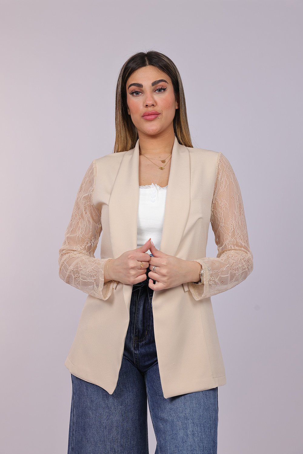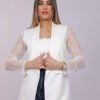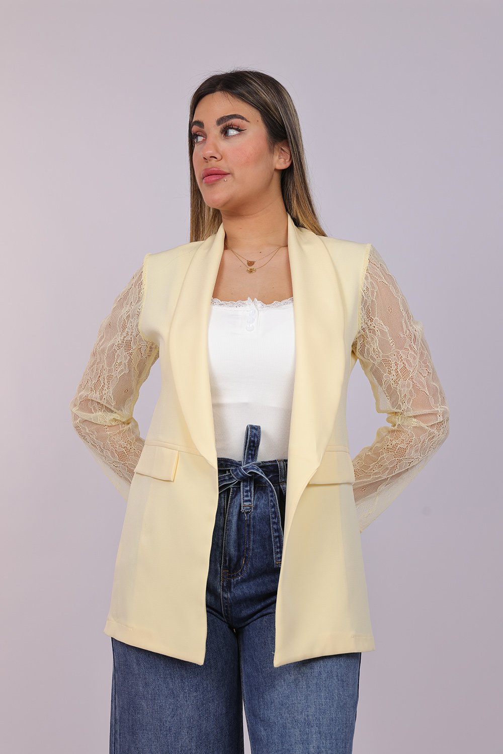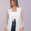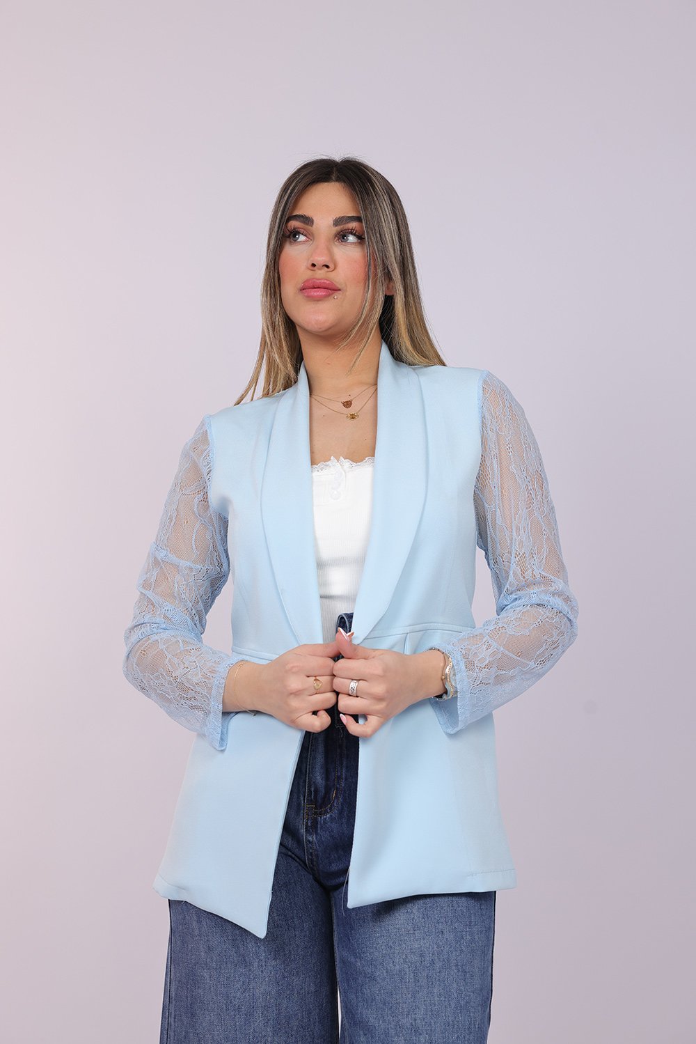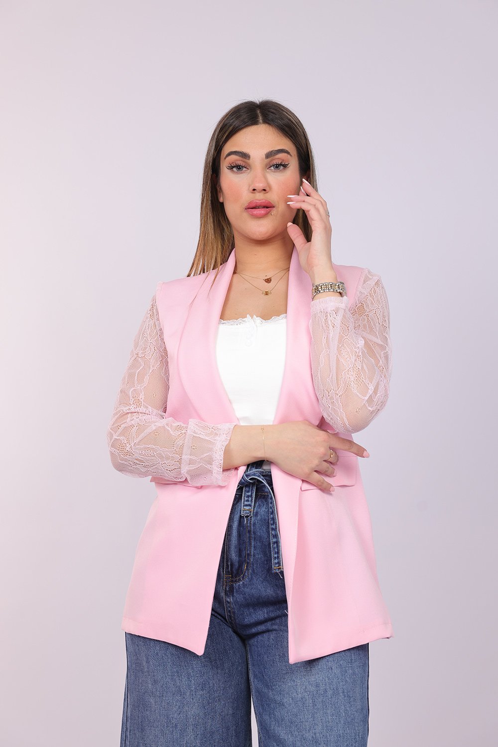 Blazer ouvert élégant avec manches en dentelle délicate, apportant une touche féminine et raffinée à votre tenue. Parfait pour un look chic au quotidien ou pour vos occasions spéciales.