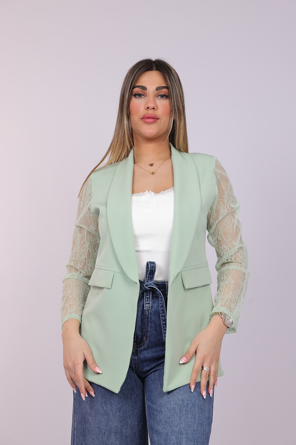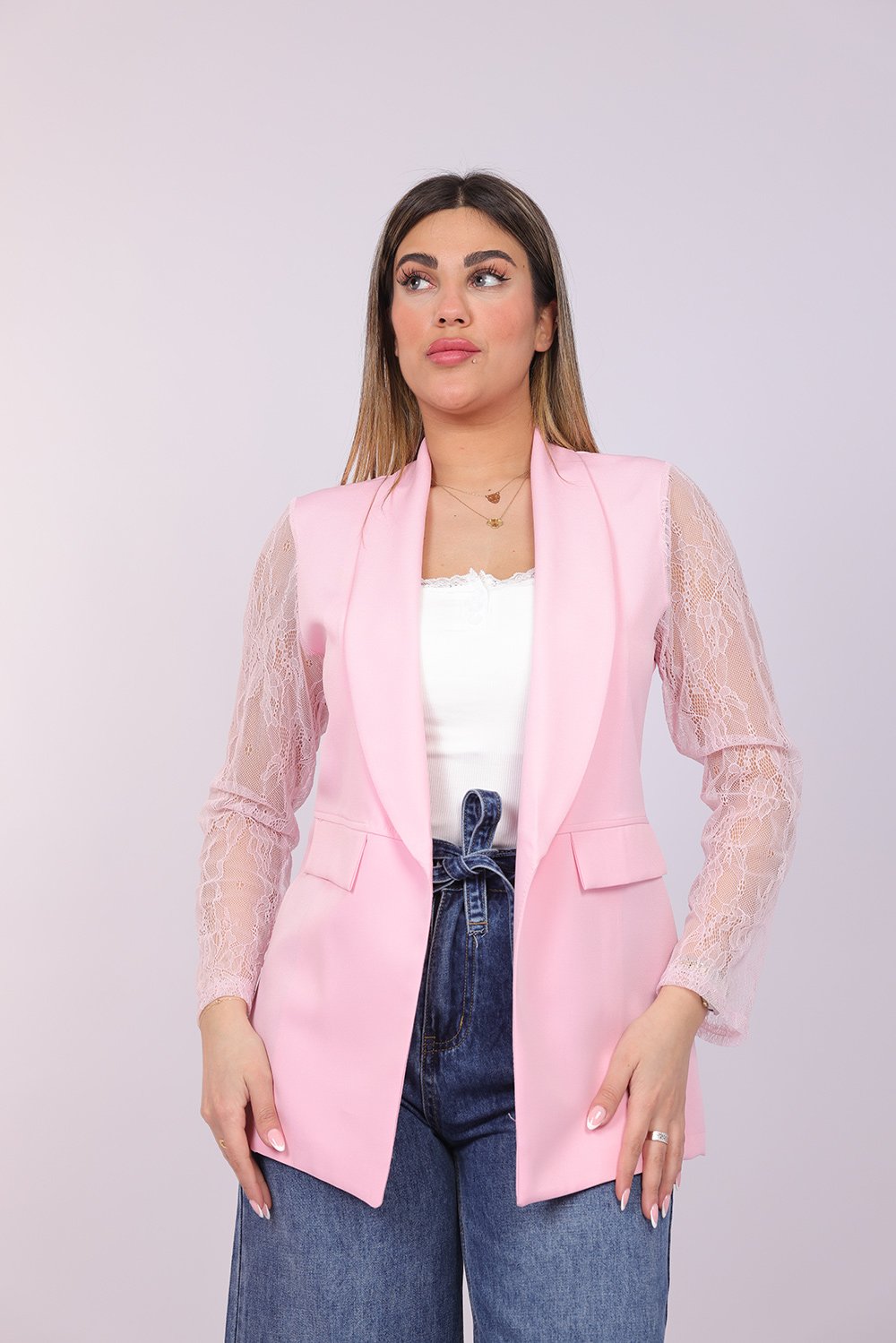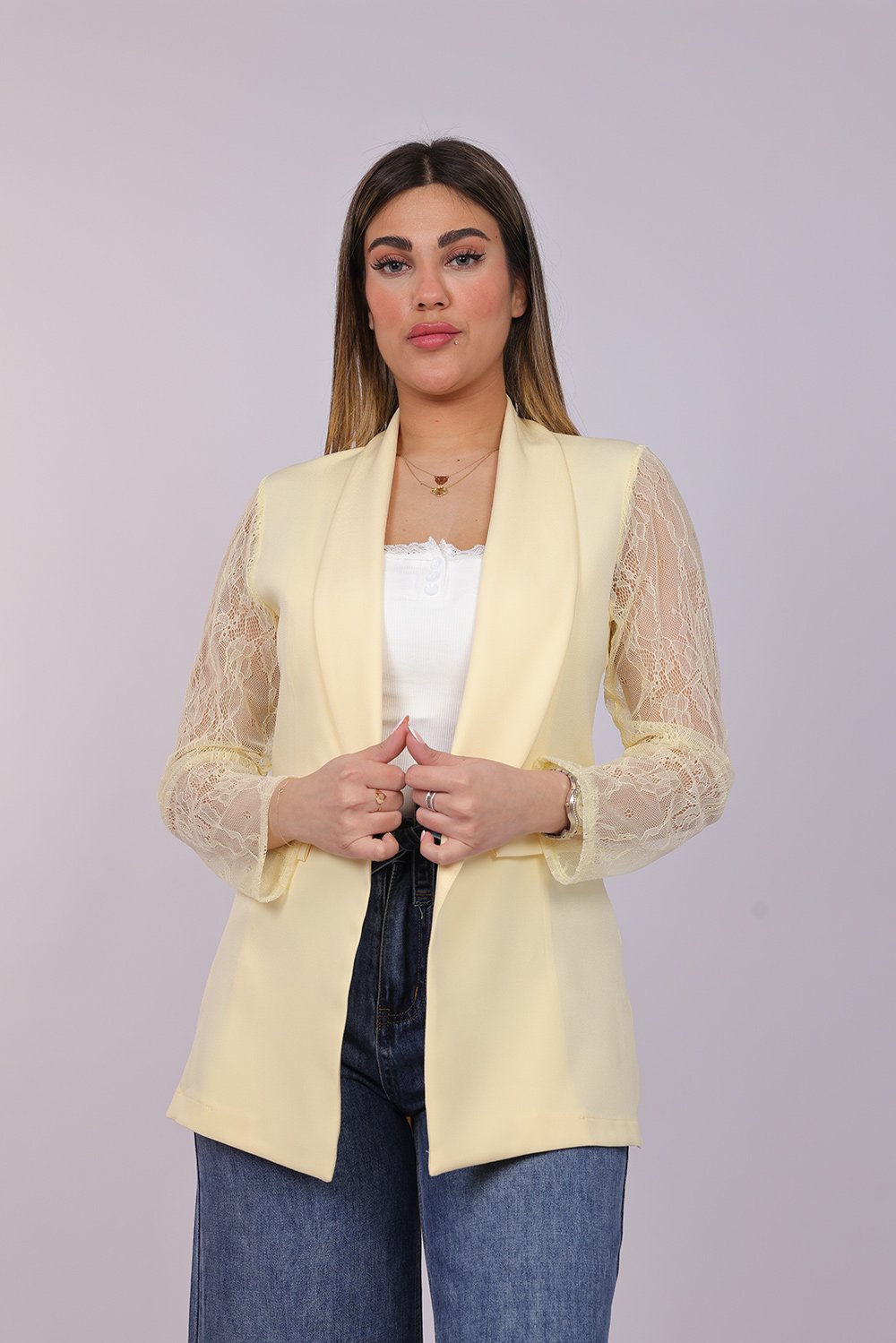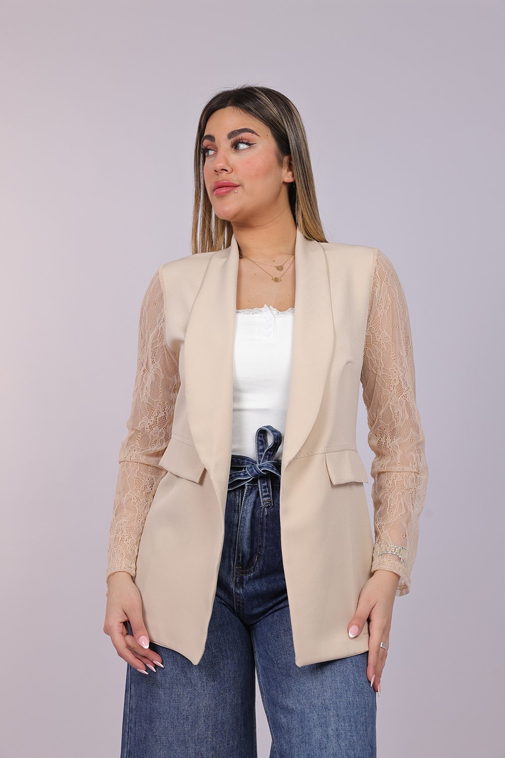 Blazer ouvert élégant avec manches en dentelle délicate, apportant une touche féminine et raffinée à votre tenue. Parfait pour un look chic au quotidien ou pour vos occasions spéciales.