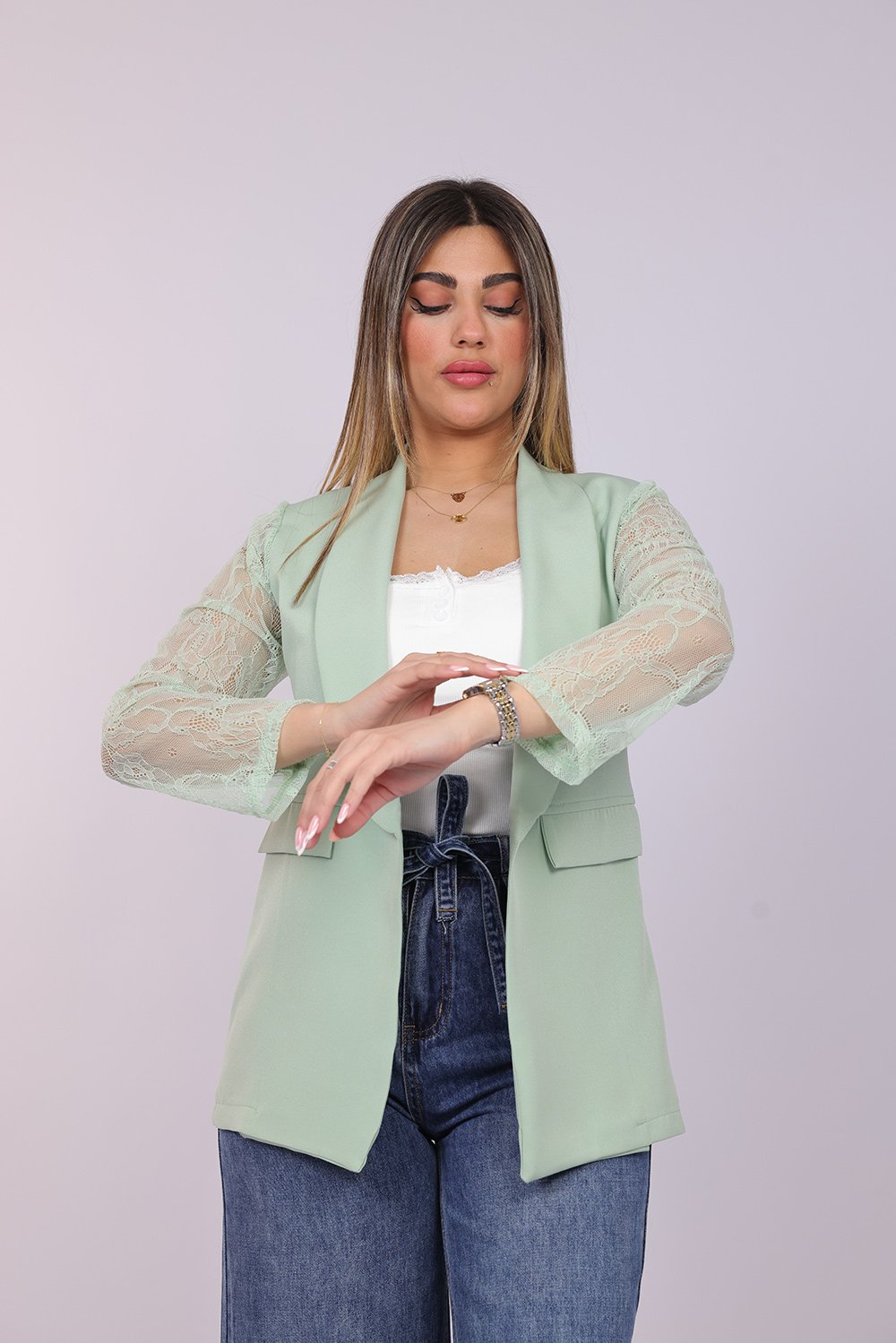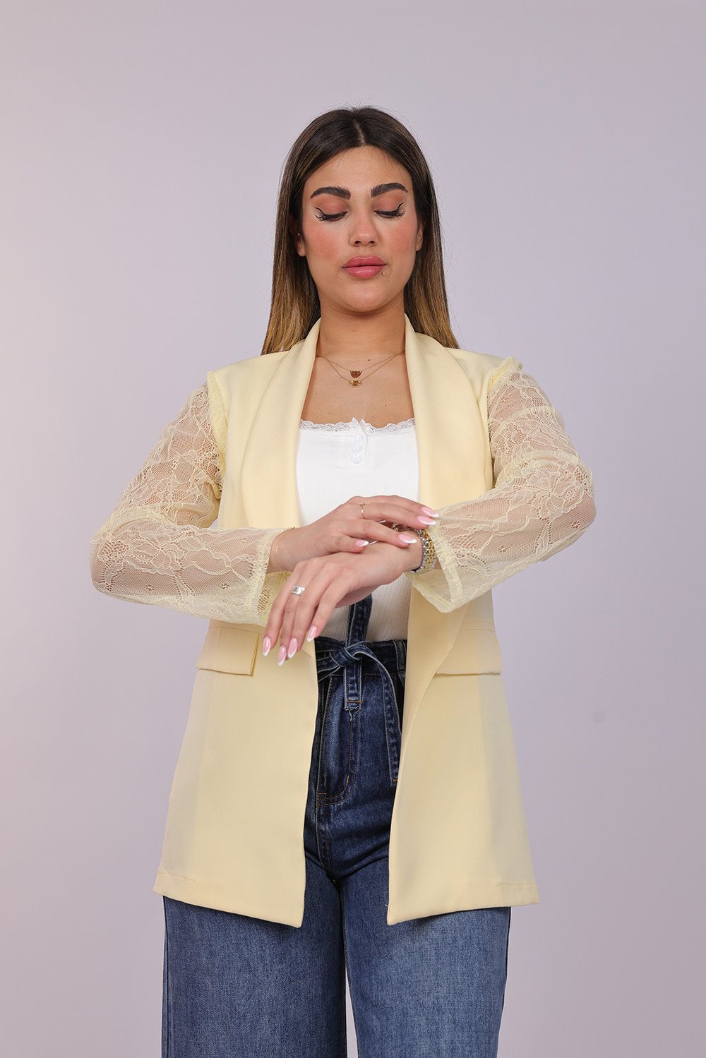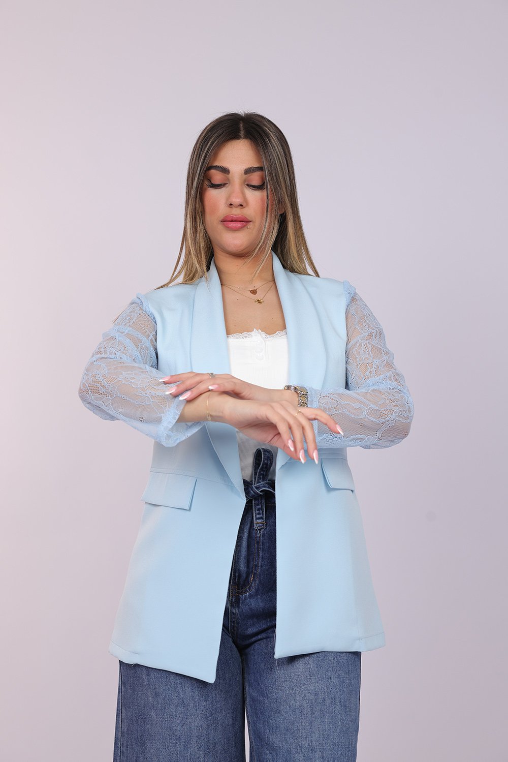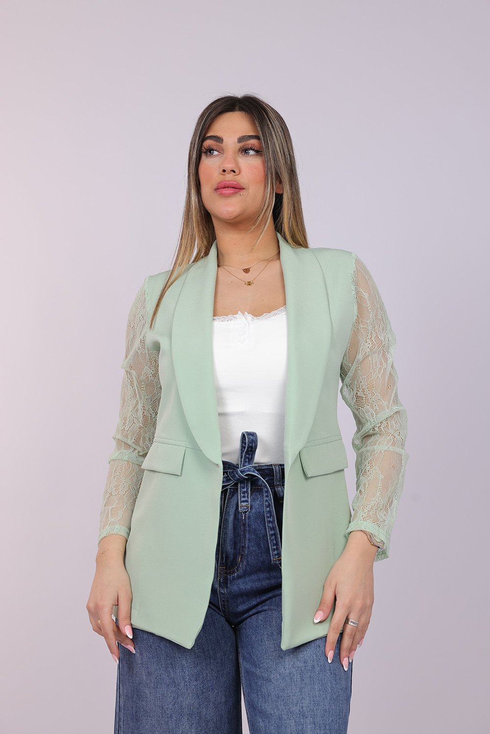 Blazer ouvert élégant avec manches en dentelle délicate, apportant une touche féminine et raffinée à votre tenue. Parfait pour un look chic au quotidien ou pour vos occasions spéciales.
