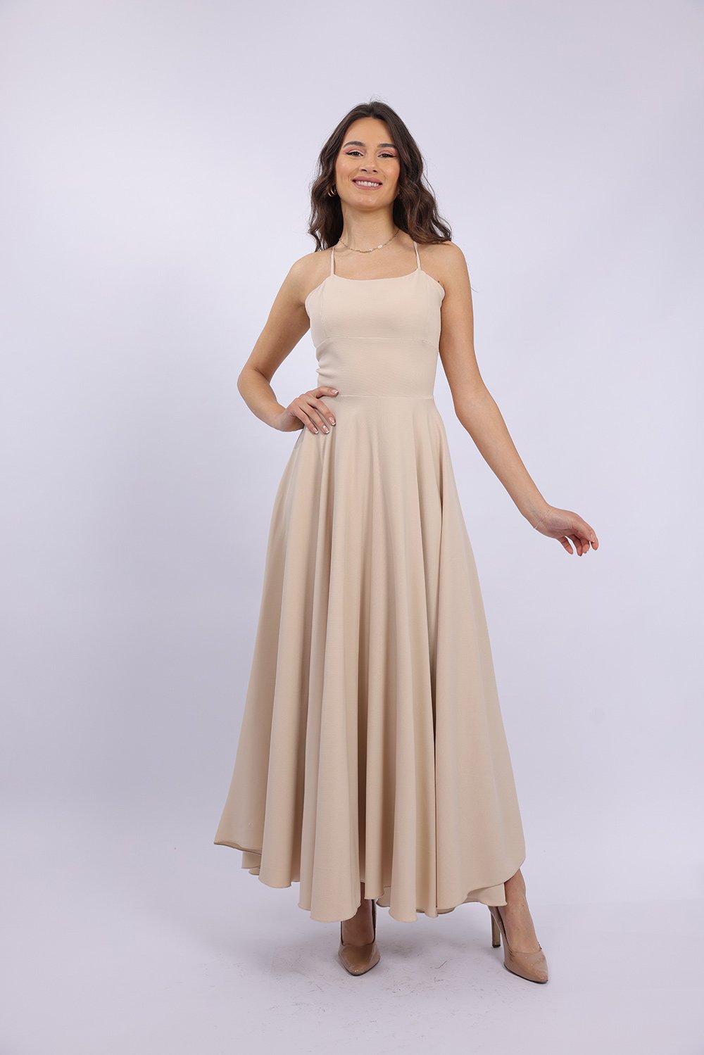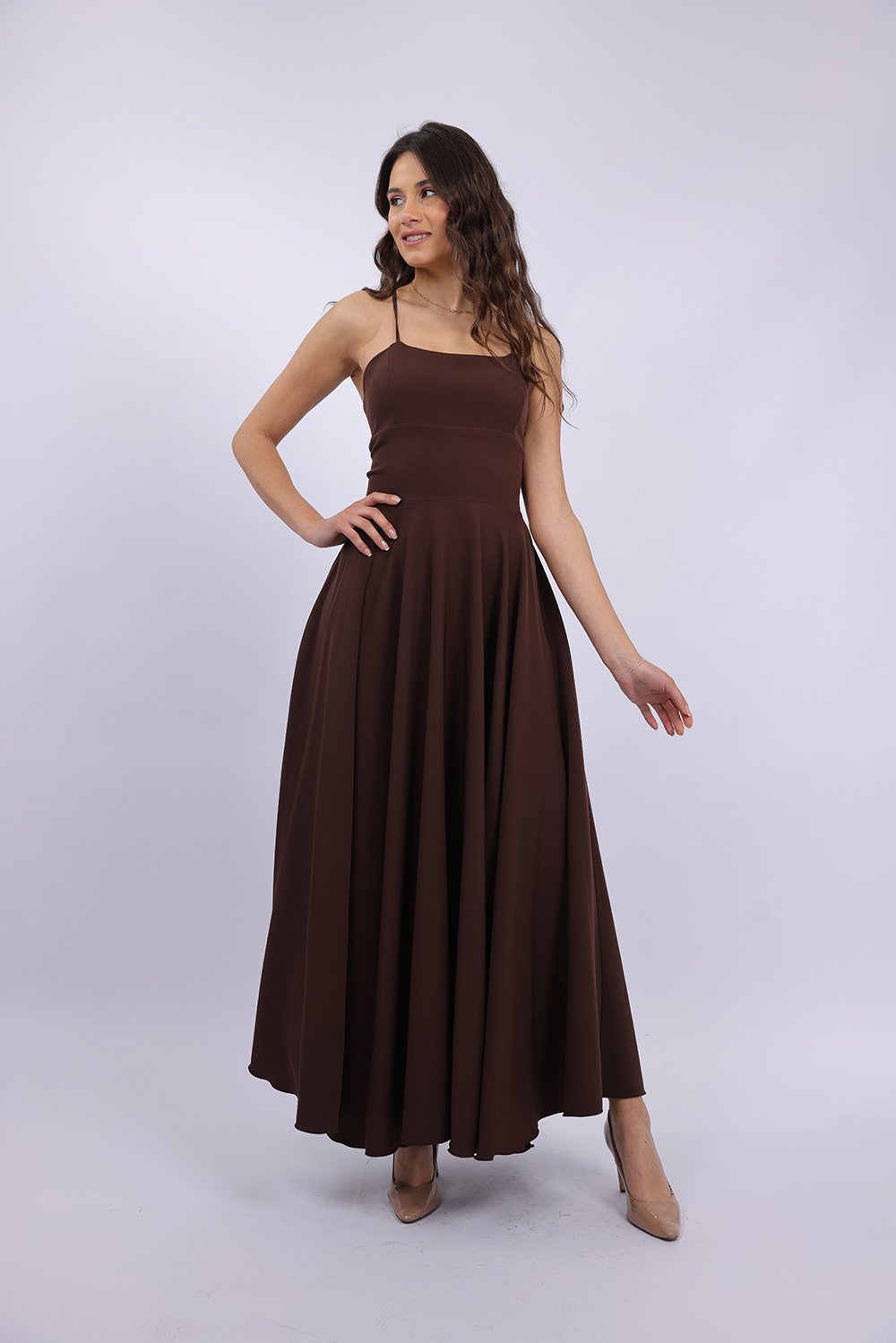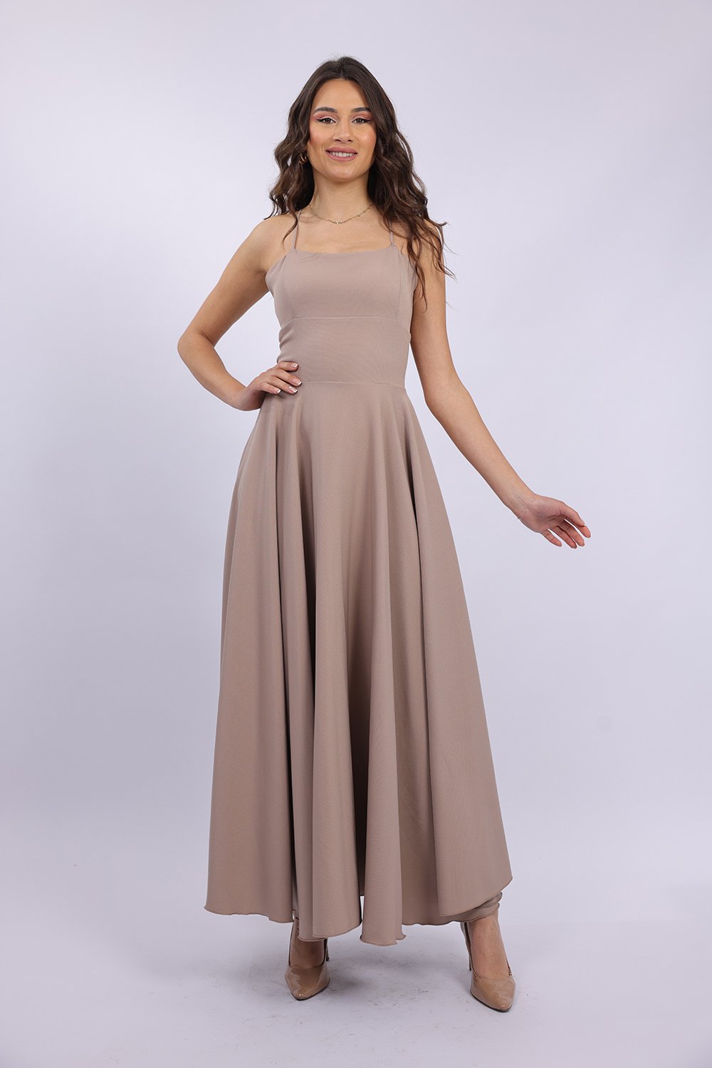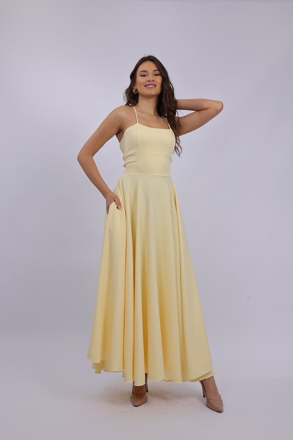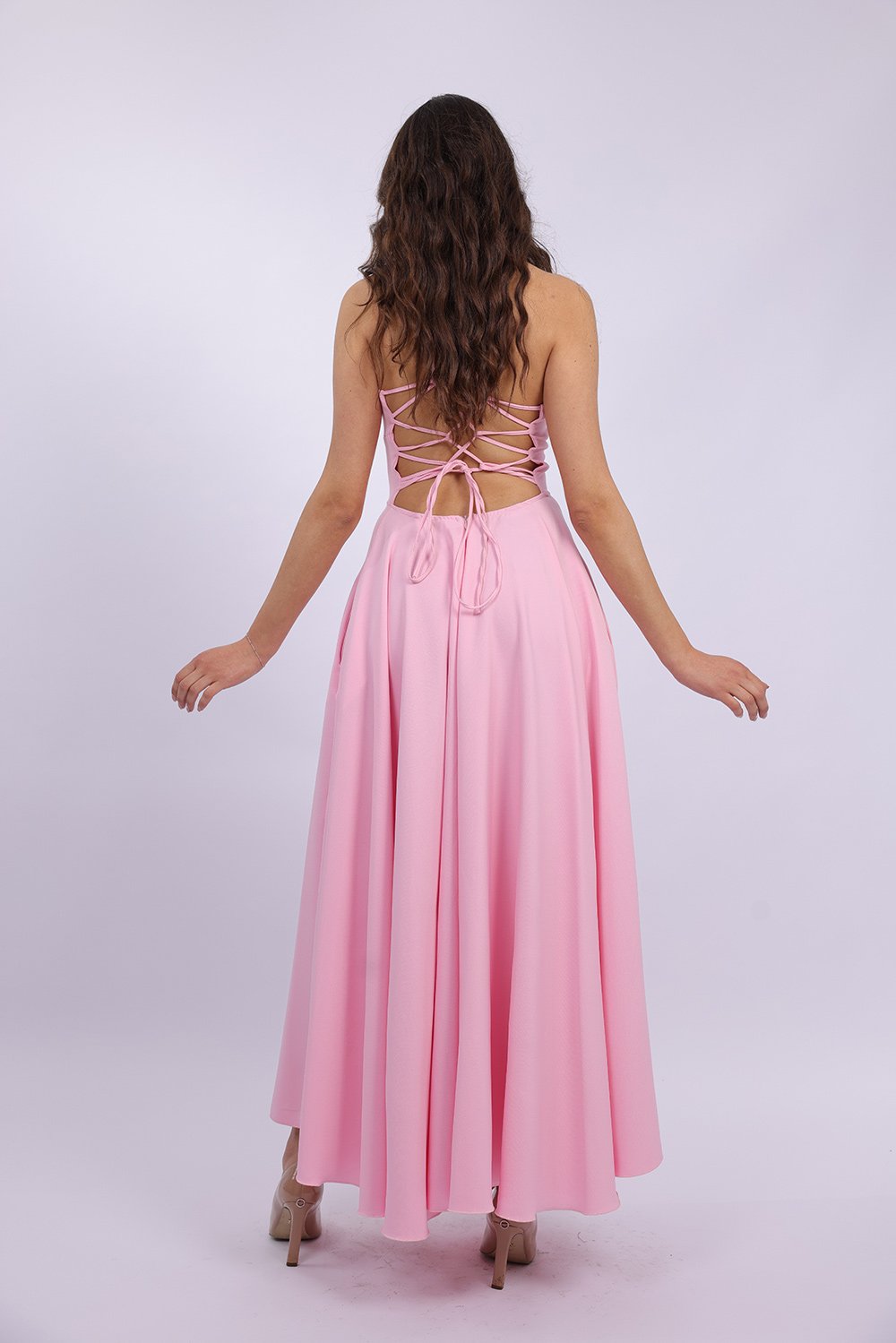 Cette robe longue élégante se distingue par sa coupe fluide et féminine qui sublime la silhouette avec légèreté. Le haut ajusté met en valeur le buste, tandis que la jupe ample apporte un mouvement gracieux à chaque pas. Son dos ouvert avec lacets croisés ajoute une touche sophistiquée et séduisante, tout en permettant un ajustement parfait. Confectionnée dans un tissu agréable et léger, elle est idéale pour vos occasions spéciales, soirées ou événements.