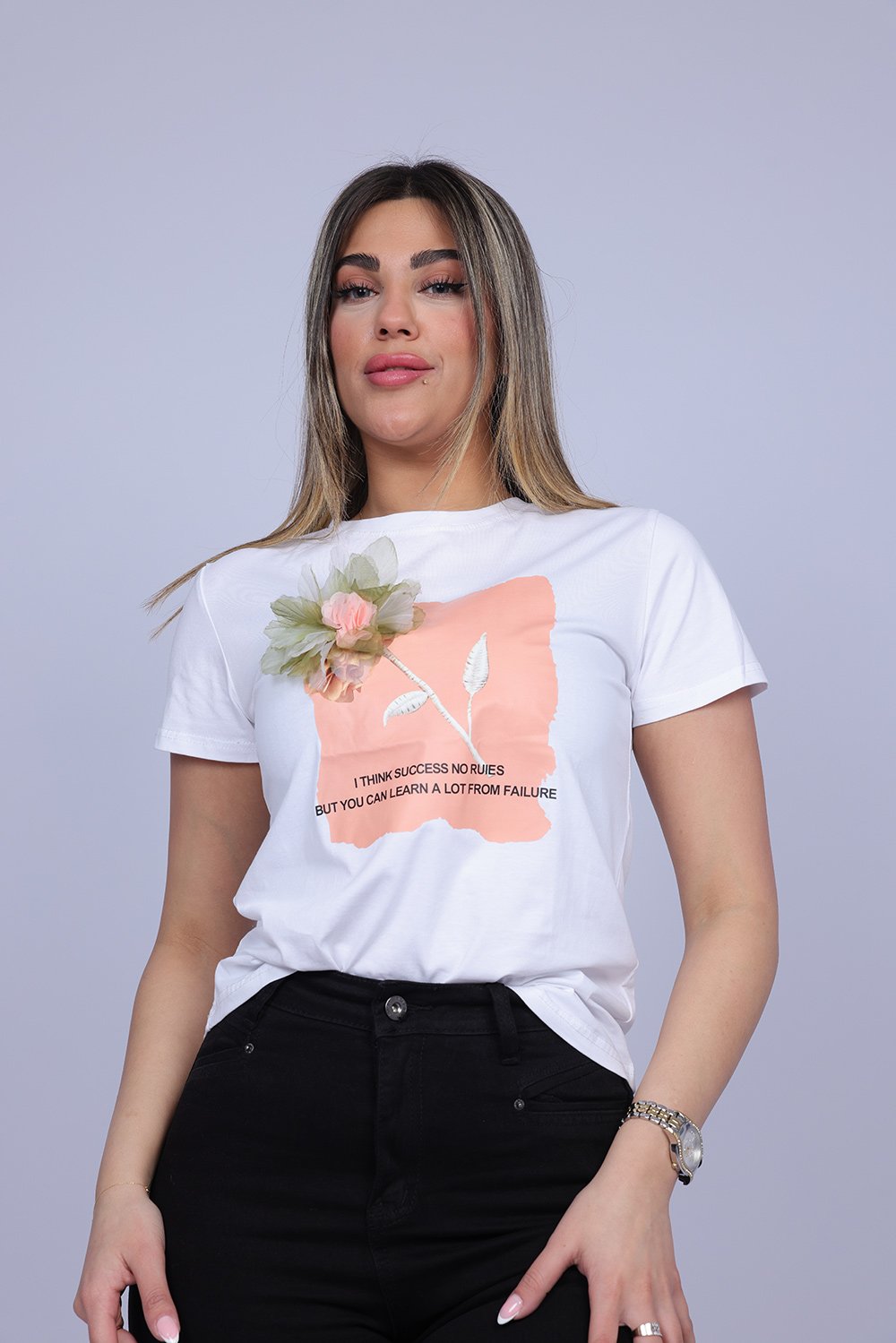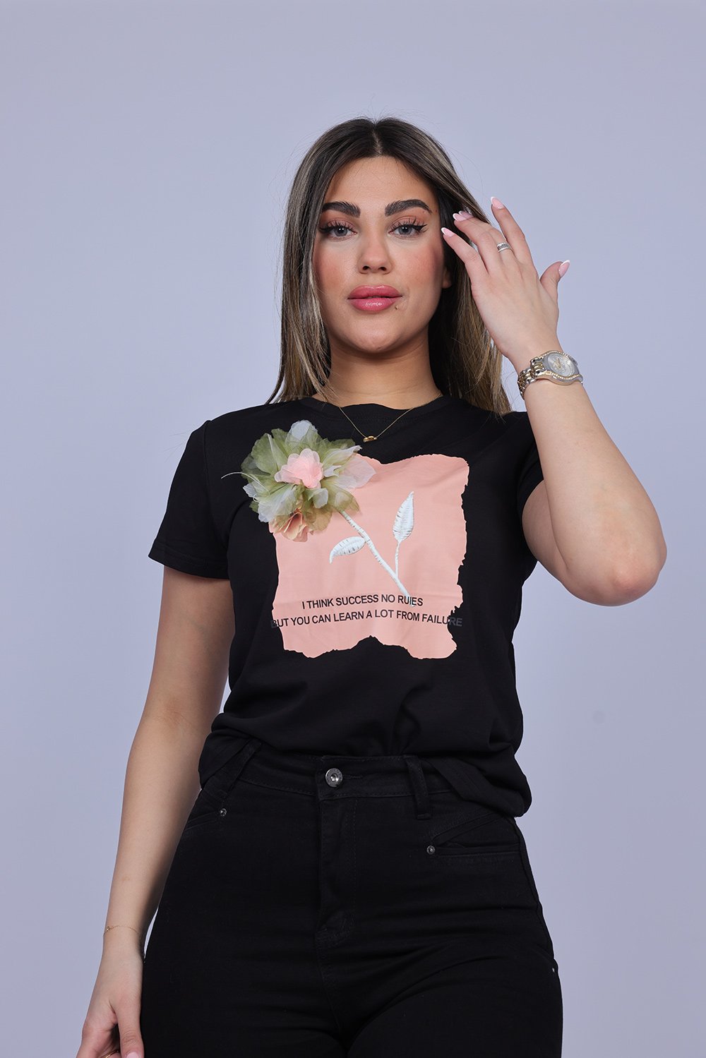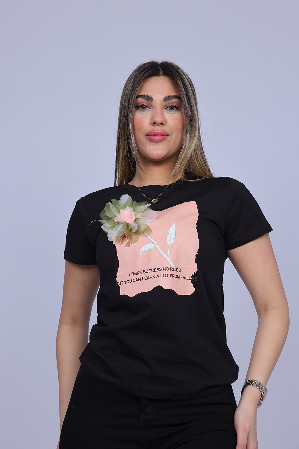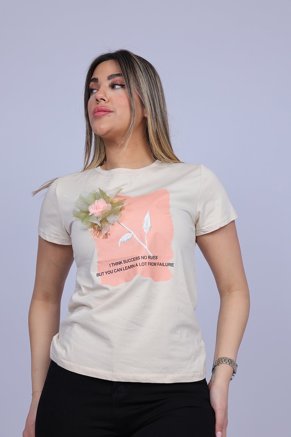 Ce t-shirt moderne se distingue par son imprimé artistique avec une touche florale en relief et un message inspirant. Sa coupe confortable et son tissu doux offrent un excellent confort au quotidien. Facile à associer, il s’intègre parfaitement dans un look casual tout en apportant une touche féminine et tendance. Idéal pour un style simple avec une note originale.