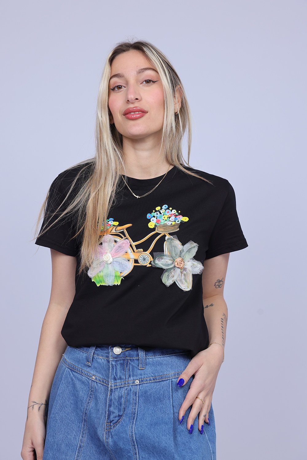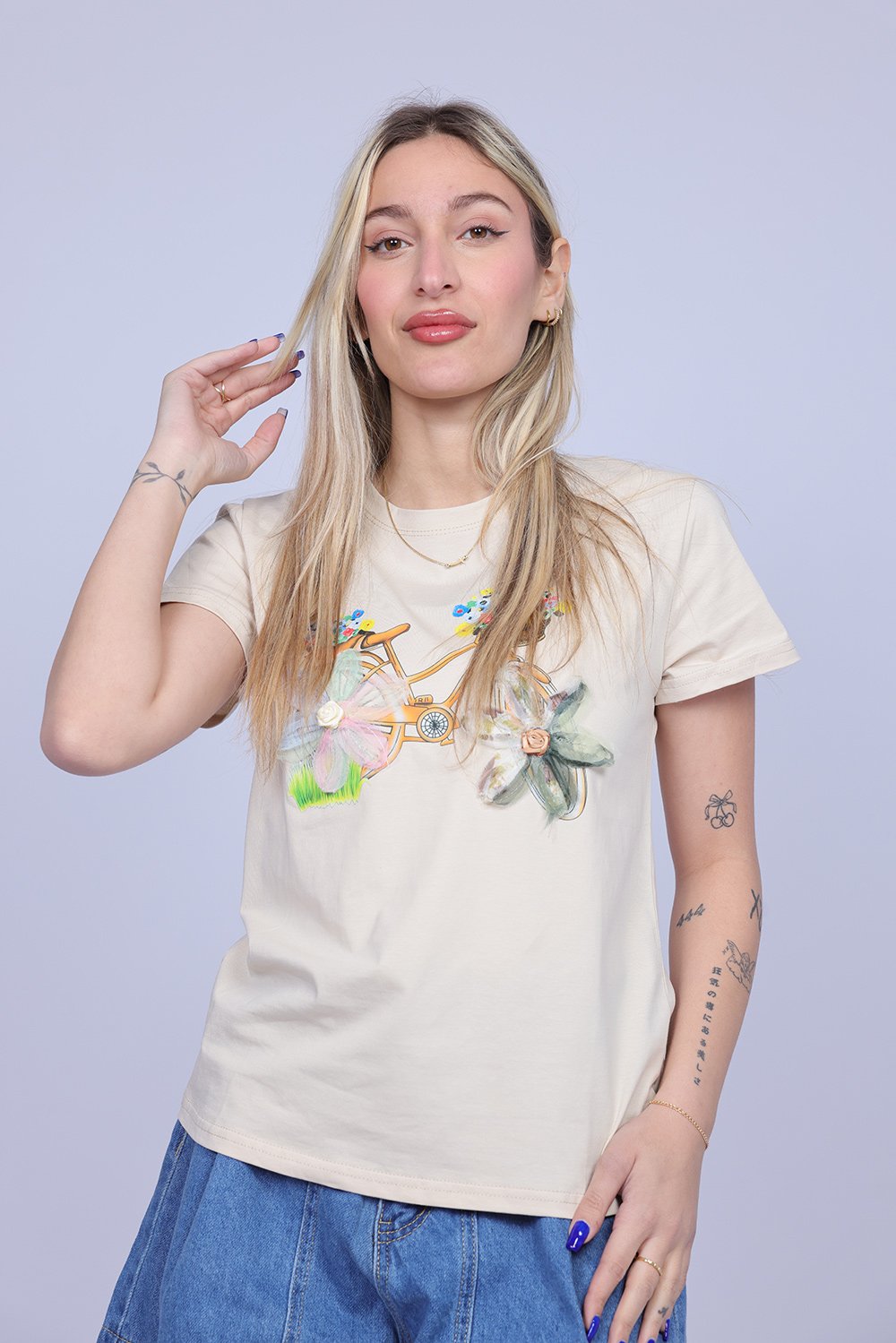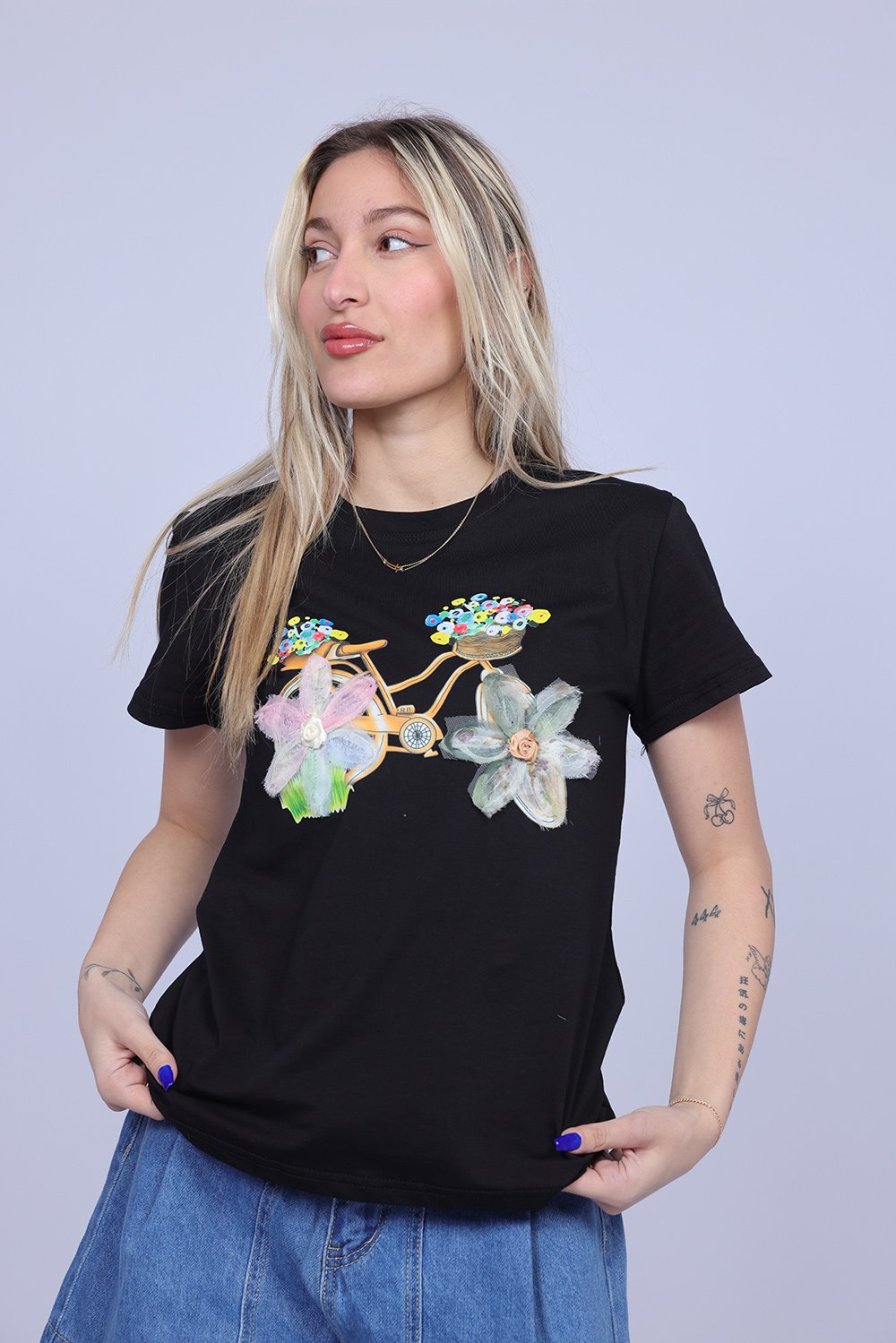 Ce t-shirt original se démarque par son motif vélo décoré de fleurs en relief, apportant une touche créative et colorée. Sa coupe confortable et son tissu doux assurent un port agréable tout au long de la journée. Parfait pour un look casual avec une note fun et féminine, il se combine facilement avec vos pièces préférées.